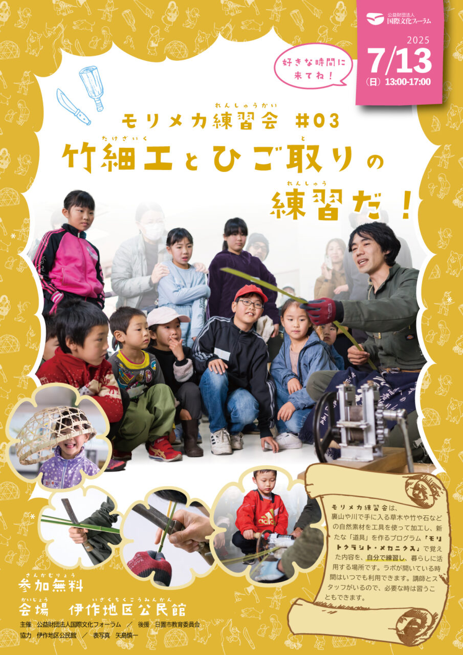 7/13(日)モリメカ練習会03-竹細工とひご取りの練習だ!/モリトクラシト・メカニクス(於:鹿児島県日置市)... モリメカ練習会は、モリトクラシト・メカニクス(通称:モリメカ)で扱う竹編みや竹割、縄ないや、刃物の使い方などを、自分のペースで練習する場所です。 モリメカ(講座...