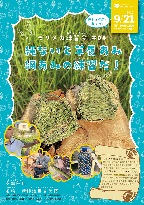 9/21(日)モリメカ練習会04- 縄ないと草履あみ、網あみの練習だ! /モリトクラシト・メカニクス(於:鹿児... モリメカ練習会は、モリトクラシト・メカニクス(通称:モリメカ)で扱う竹編みや竹割、縄ないや、刃物の使い方などを、自分のペースで練習する場所です。 モリメカ(講座...