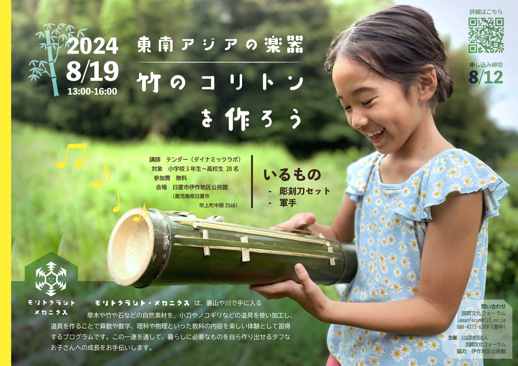8/19 東南アジアの楽器「竹のコリトン」を作ろう(於:鹿児島県日置市)ー「モリトクラシト・メカニクス」... 竹を小刀で削って、東南アジアの楽器コリトンを作ります。本体だけでなく弦も竹の皮を使います。やさしく、心地いい音色のする楽器です。 身近な自然素材である竹から自分...