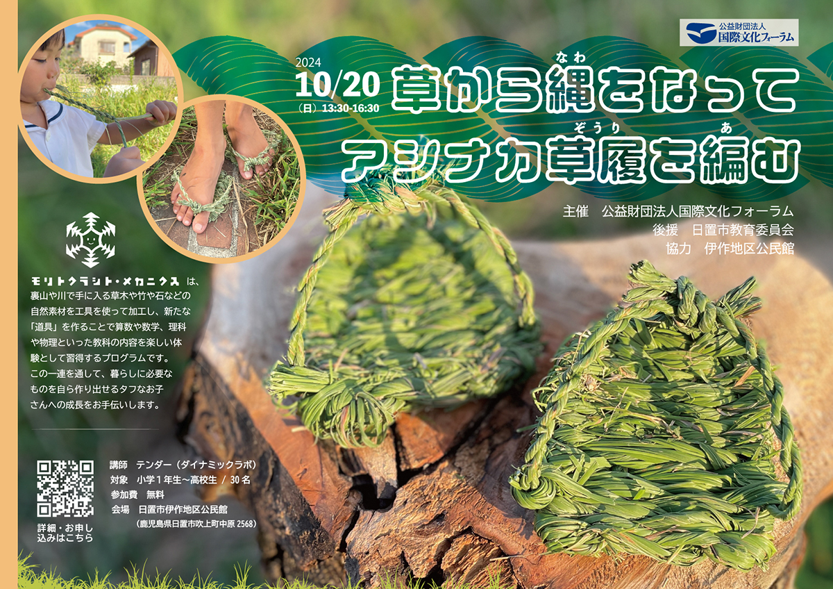 10/20 草から縄をなってアシナカ草履を編む(於:鹿児島県日置市)ー「モリトクラシト・メカニクス」シリー... 「テンダーさんのその辺のもので生きる」オンライン講座でも人気の高かった「縄ない」と「アシナカ草履」の講座を、モリトクラシト・メカニクスの第3弾として開催します。 ...