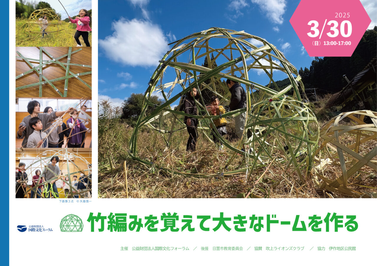 3/30 竹編みを覚えて大きなドームを作る(於:鹿児島県日置市)/「モリトクラシト・メカニクス」シリーズ06... 竹編みの技術を応用して、人が入れる大きさのドームを作ります。まず、手元で扱える大きさの六つ目や五つ目を編みます。手元サイズで編みの構造を理解したら、近くの竹山に...