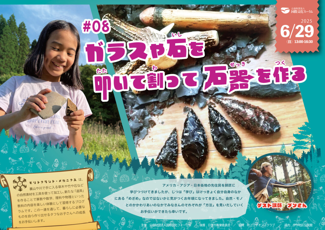 6/29 ガラスや石を叩いて割って石器を作る(於:鹿児島県日置市)/モリトクラシト・メカニクス08 | お知ら... 今回の素材は、モリトクラシト・メカニクスシリーズでは初めて扱う「石」です。石器作りの専門家、ブンさんを講師にお招きし、ガラスや石を叩いて割って、刃物として使える...